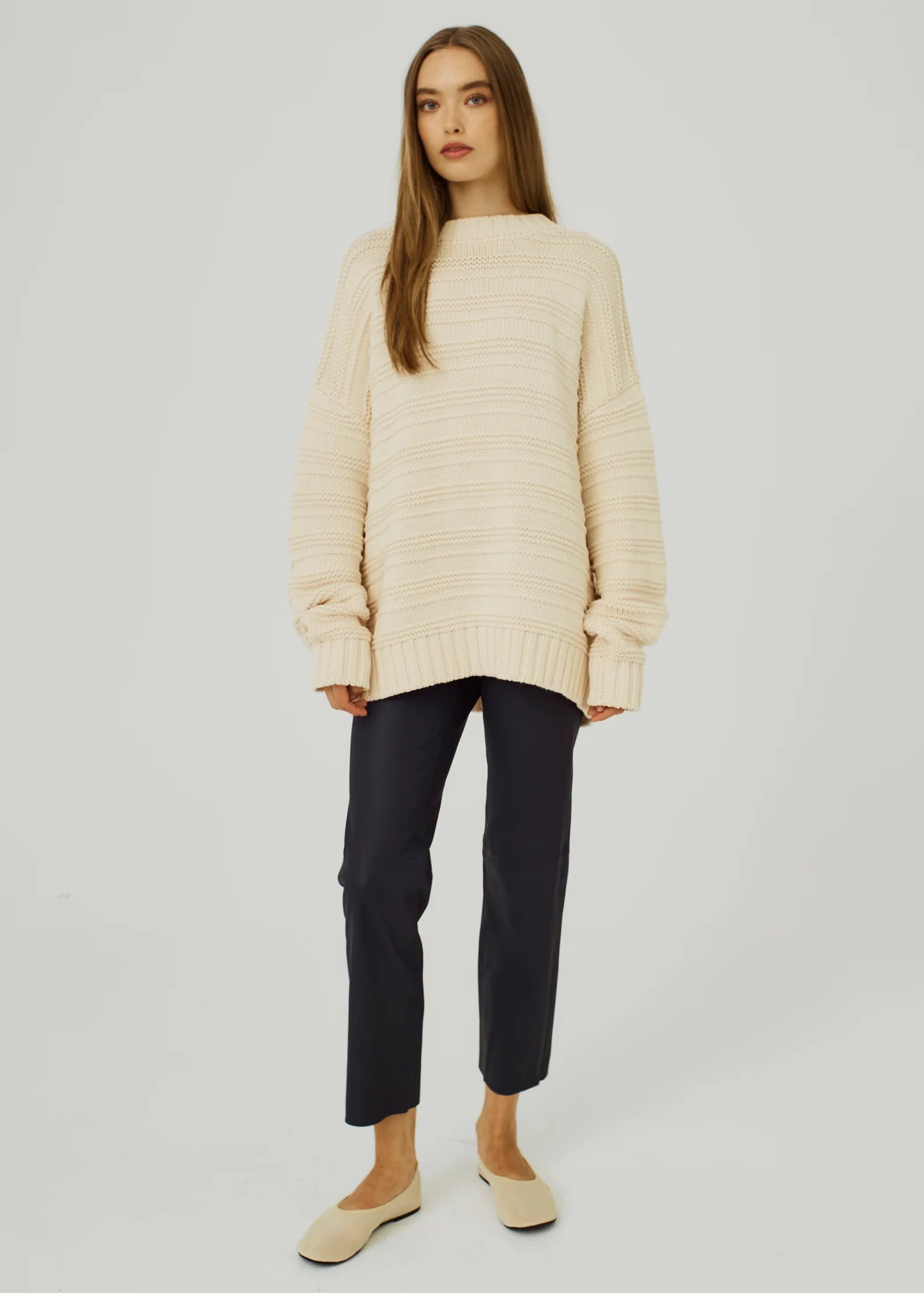 These leggings are made of soft, stretchy lamb leather. They are high-waisted, with slightly cropped straight legs.