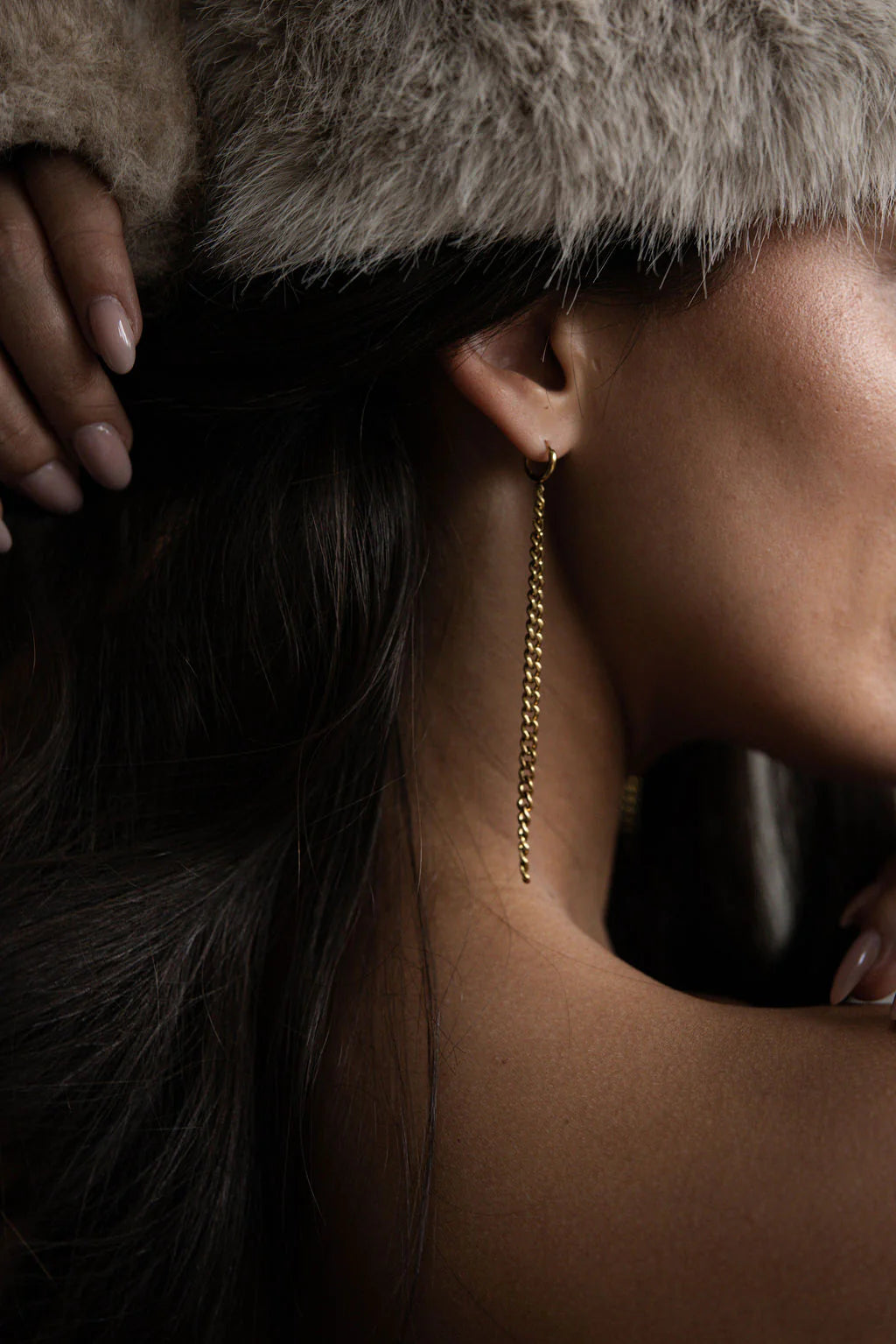 Verfijnde oorbellen met een kleine, elegante hoop en lange, slanke ketting die subtiel langs de halslijn valt. Het minimalistische ontwerp geeft een moeiteloos chique uitstraling en voegt beweging en finesse toe aan elke look.