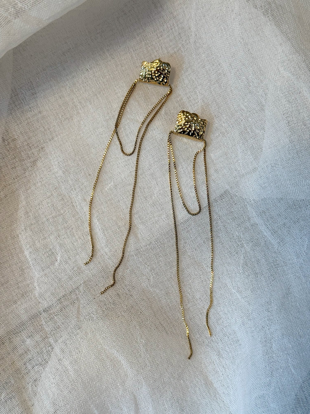 Statement oorbellen met een vierkante stud en twee fijne, lange kettingen die elegant meebewegen. De combinatie van textuur en lengte creëert een krachtige maar vrouwelijke uitstraling - minimalistisch met een uitgesproken karakter.